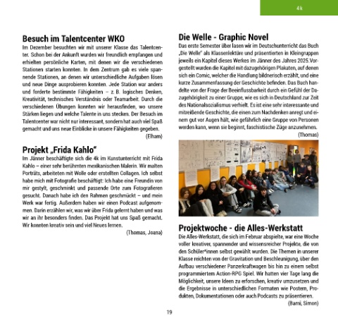 Man glaubt gar nicht, wie schnell die letzten vier Jahre ver- Ein besonderes Highlight des letzten Schuljahres waren die be- Im Dezember besuchten wir mit unserer Klasse das Talentcen- Das erste Semester über lasen wir im Deutschunterricht das Buch